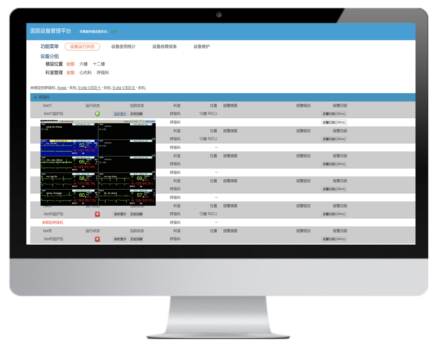 病床綁定、患者體征實時監(jiān)護、精確告警、告警響應處置等